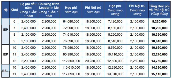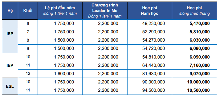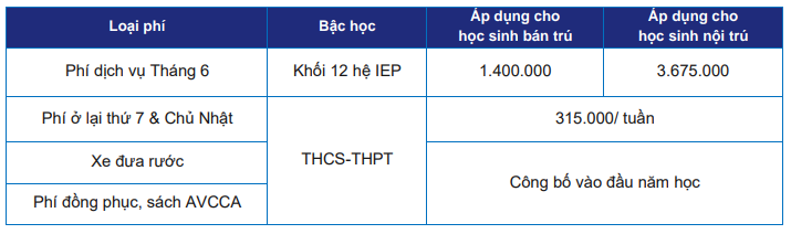- Học phí: được tính trọn năm học; chưa bao gồm thời gian học định hướng; chưa bao gồm khóa hè tự chọn và các hoạt động ngoại khóa khác theo nhu cầu của Cha mẹ học sinh/Người giám hộ (CMHS).